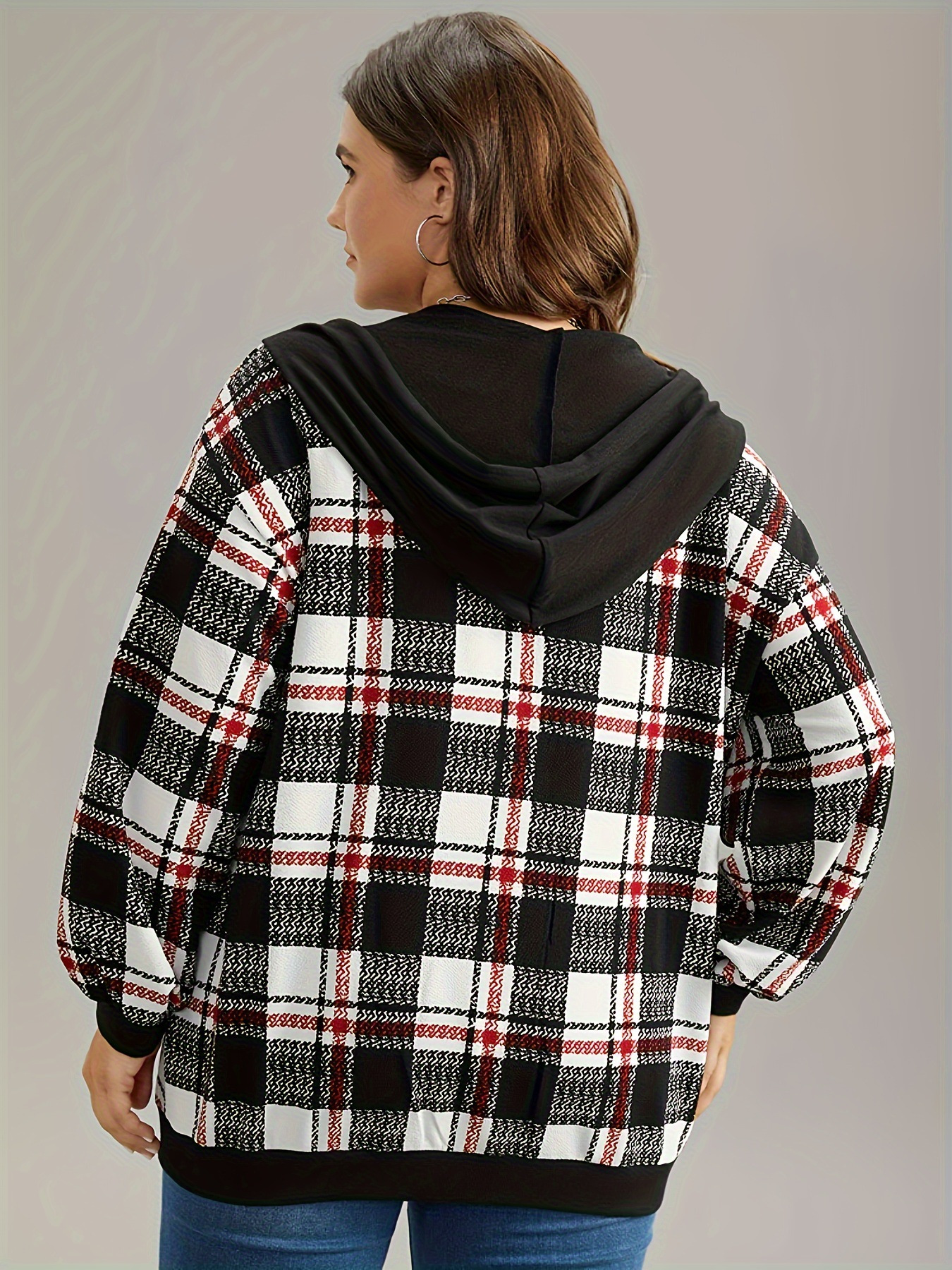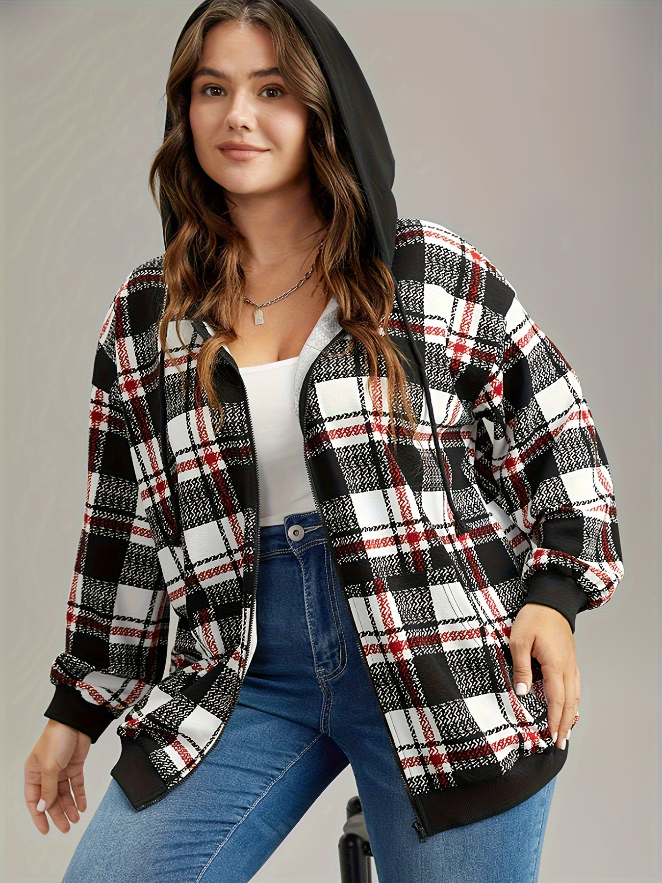1pc Plus Size Women'S Casual Gingham Hooded Jacket - Polyester Blend, Slight Stretch, Woven Zip-Up Hoodie for Spring/Fall