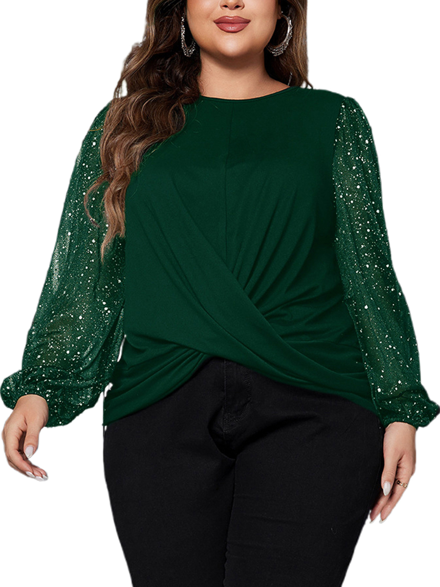 1pc Women'S Plus Size Casual Round Neck Long Sleeve Blouse with Cross Wrap Design, Polyester Fabric, Spring/Autumn Season, Basic Solid Color Top with Bubble Detail