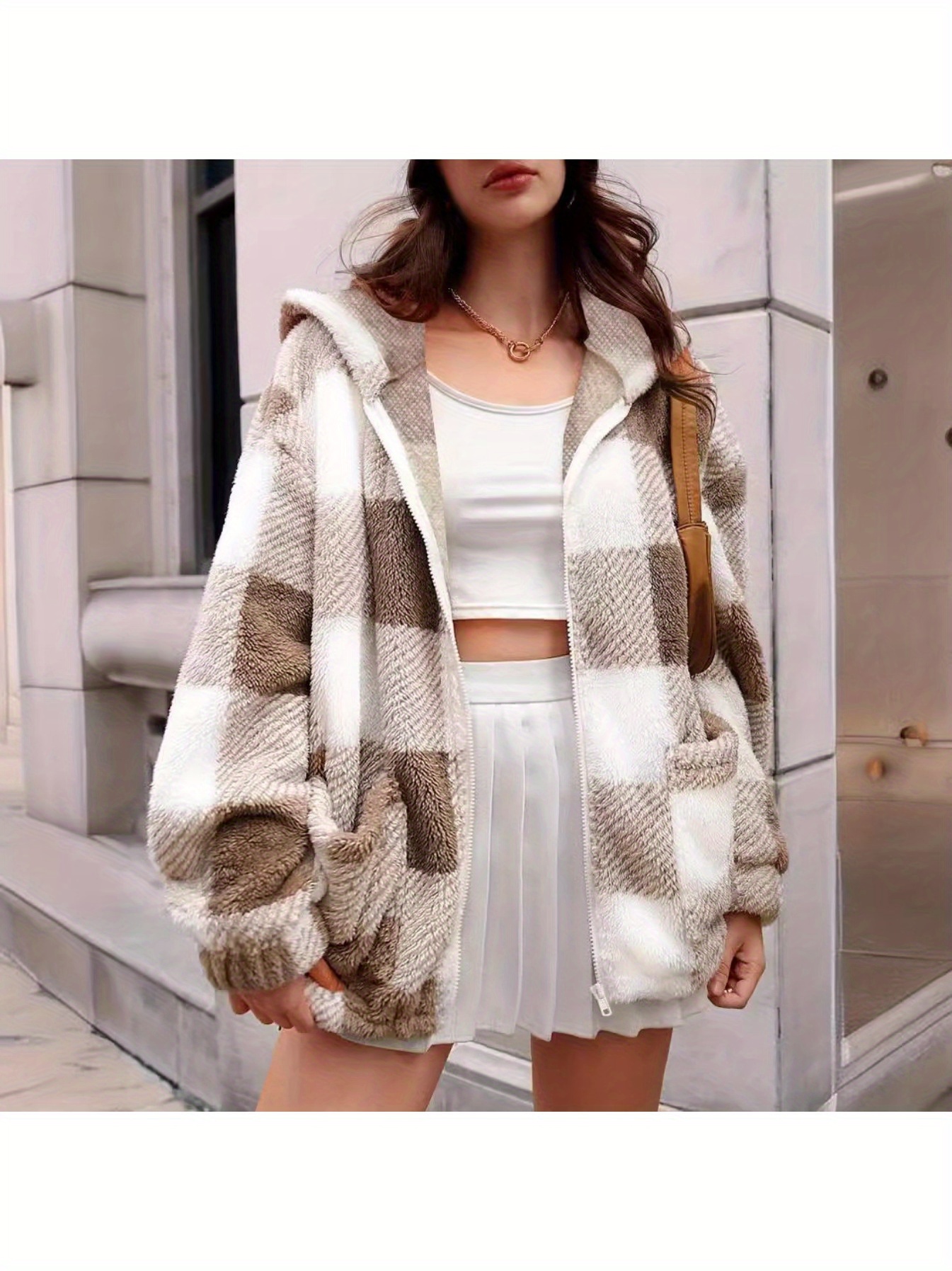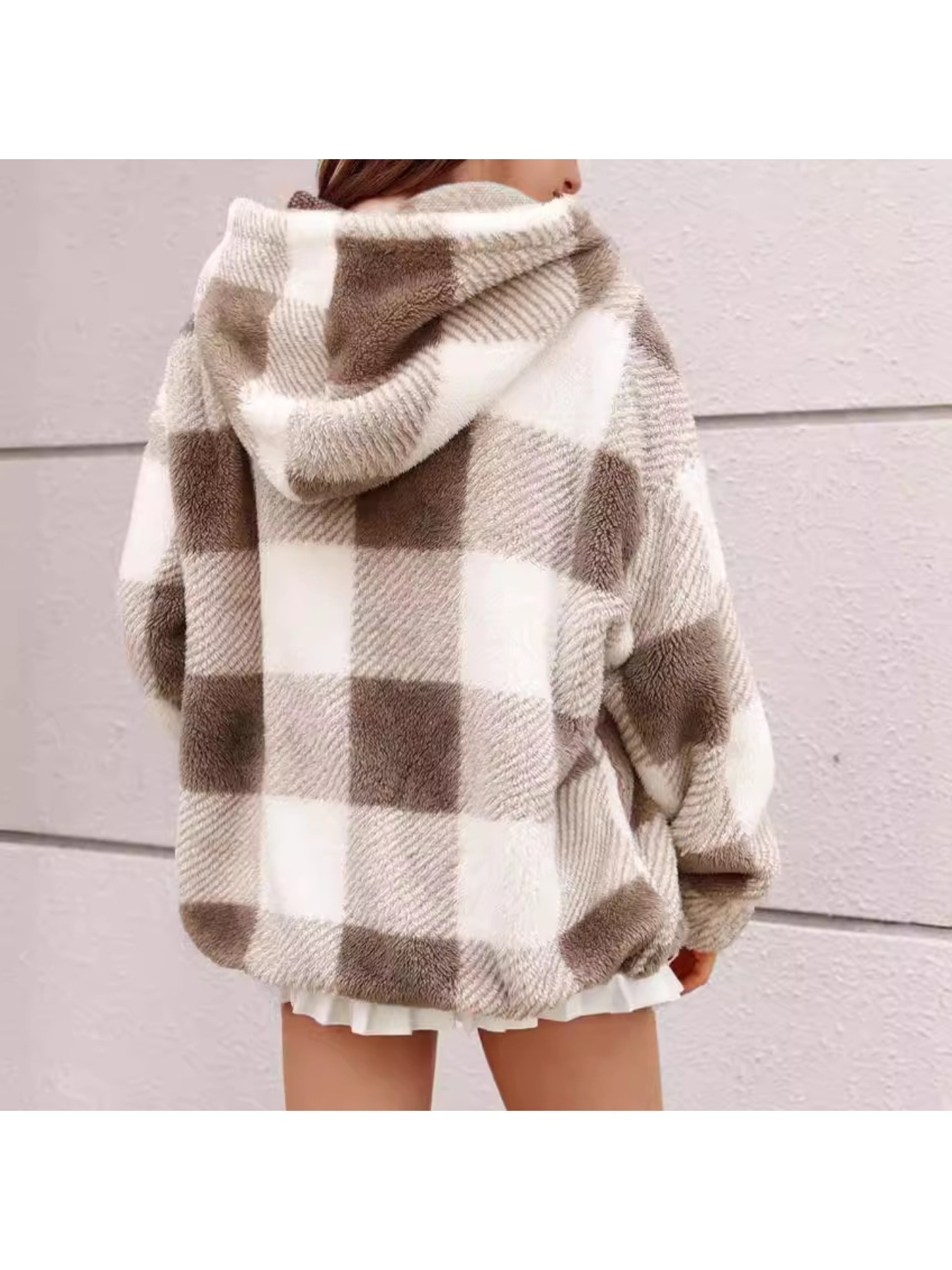 1pc Women'S Plus Size Plaid Hooded Jacket - Casual Polyester Knit Fabric with Pockets, Slight Stretch, Warm Fleece-Lined Outerwear for Fall/Winter