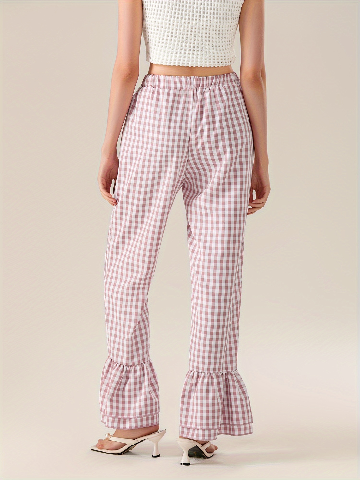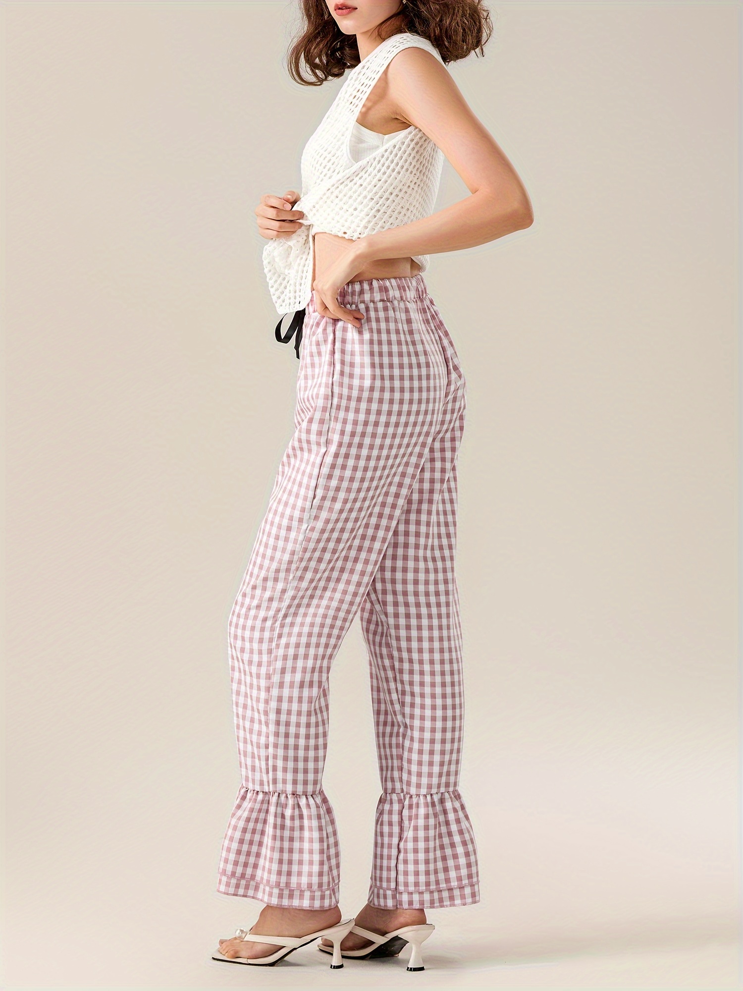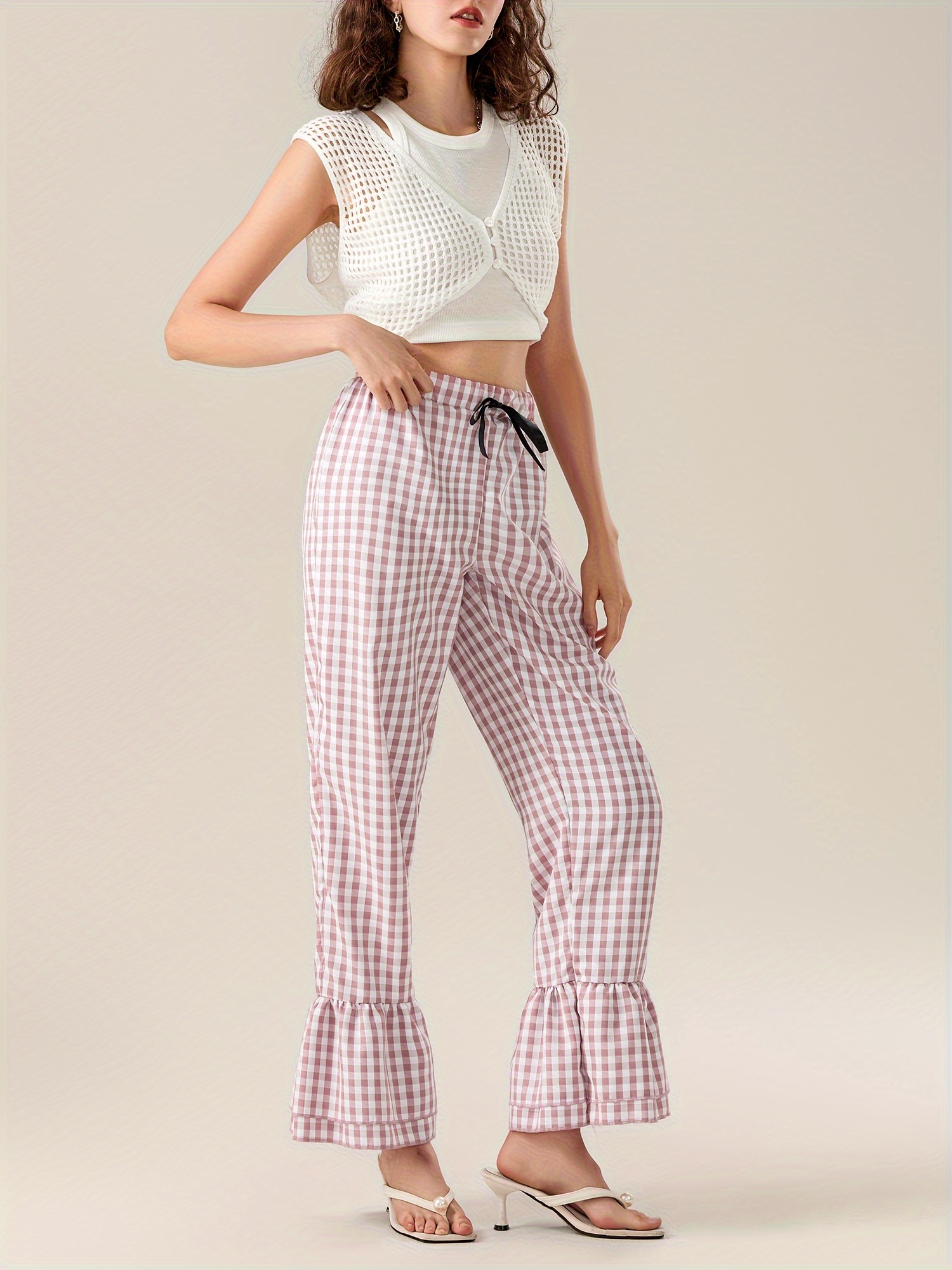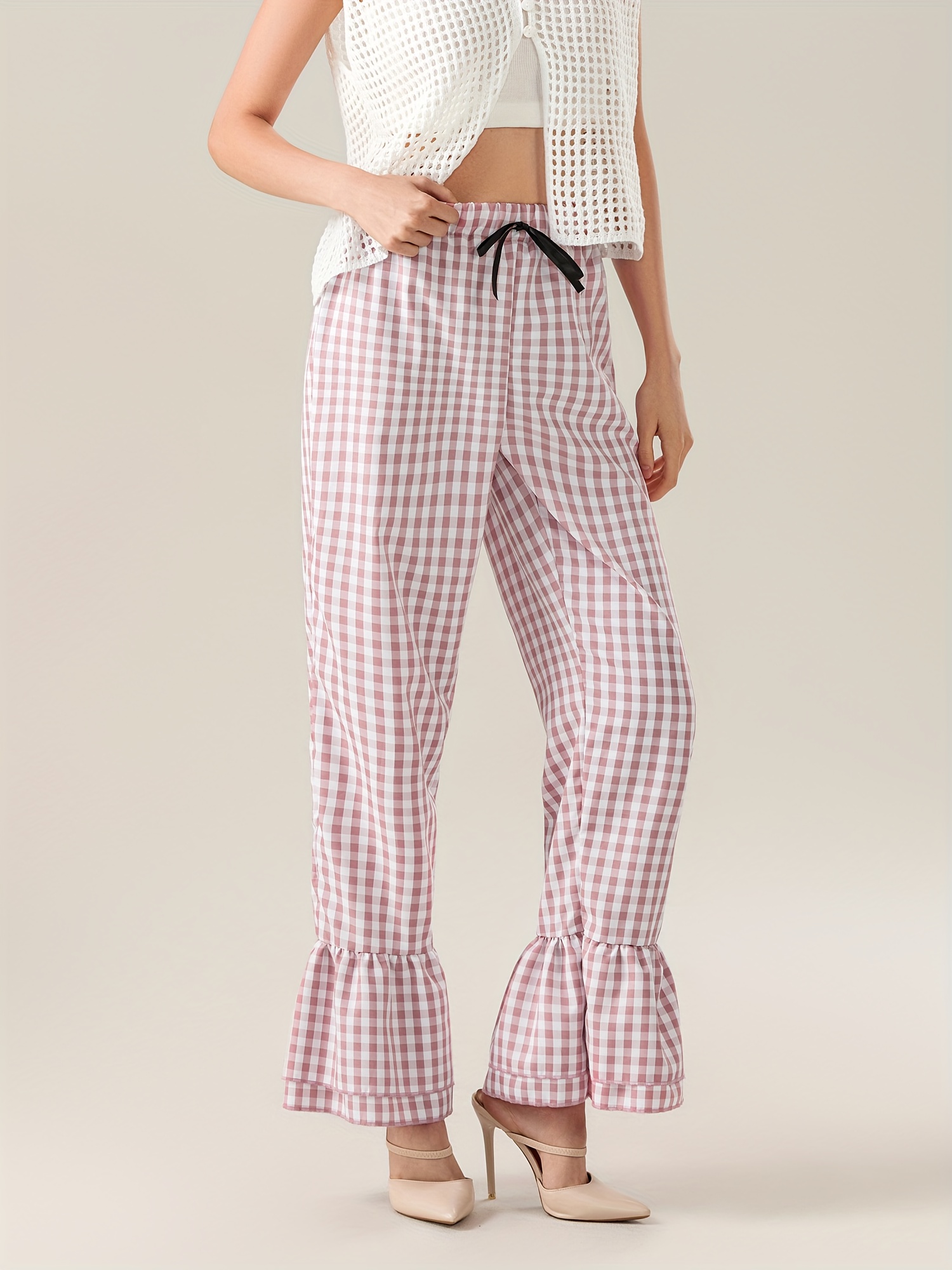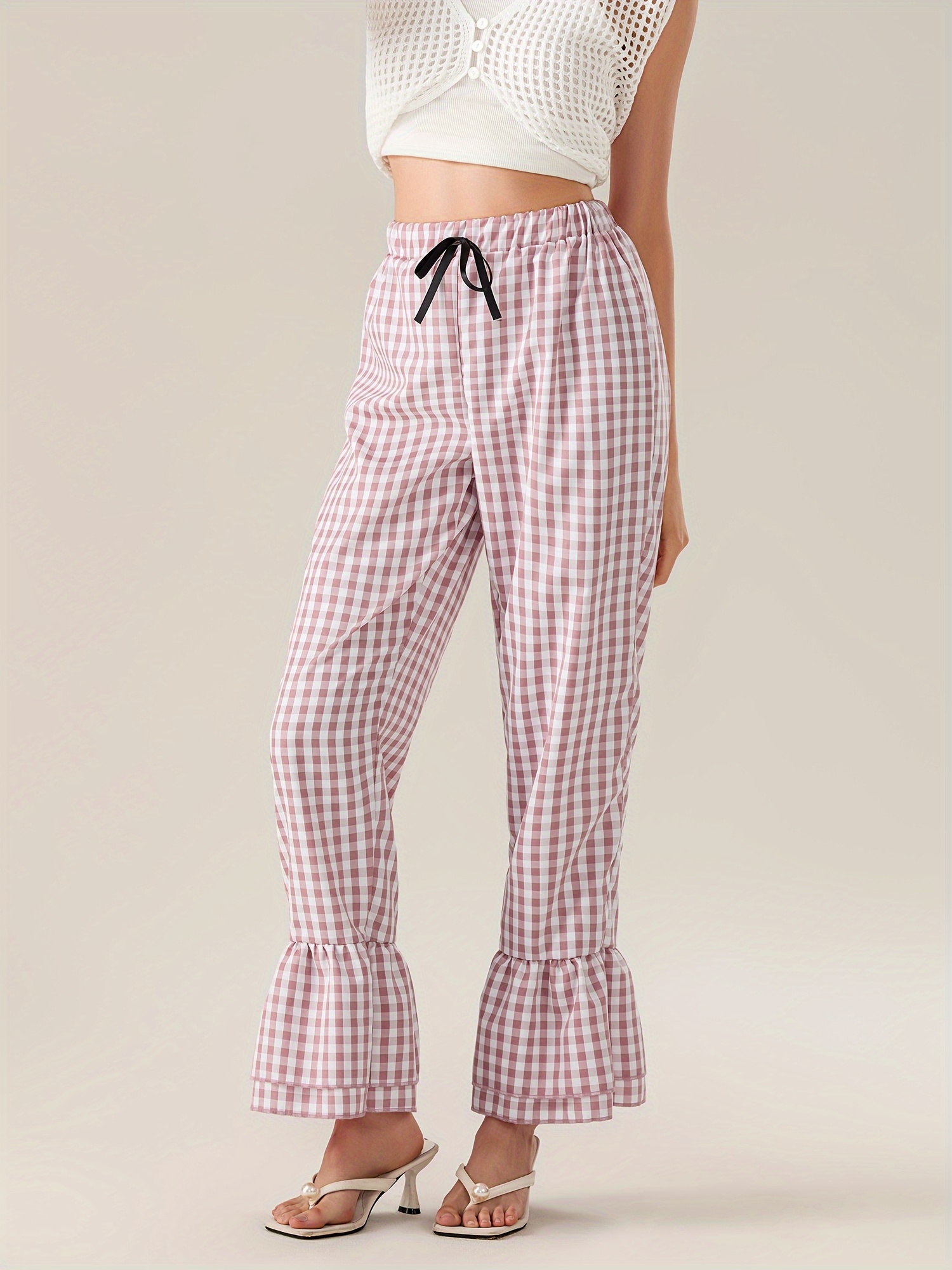 1pc Women'S Tartan Flared Pants - Casual Polyester Wide Leg with Tiered Ruffle, Lace-Up Bow Elastic Waistband, Full-Length Pull-On Trousers for All Seasons