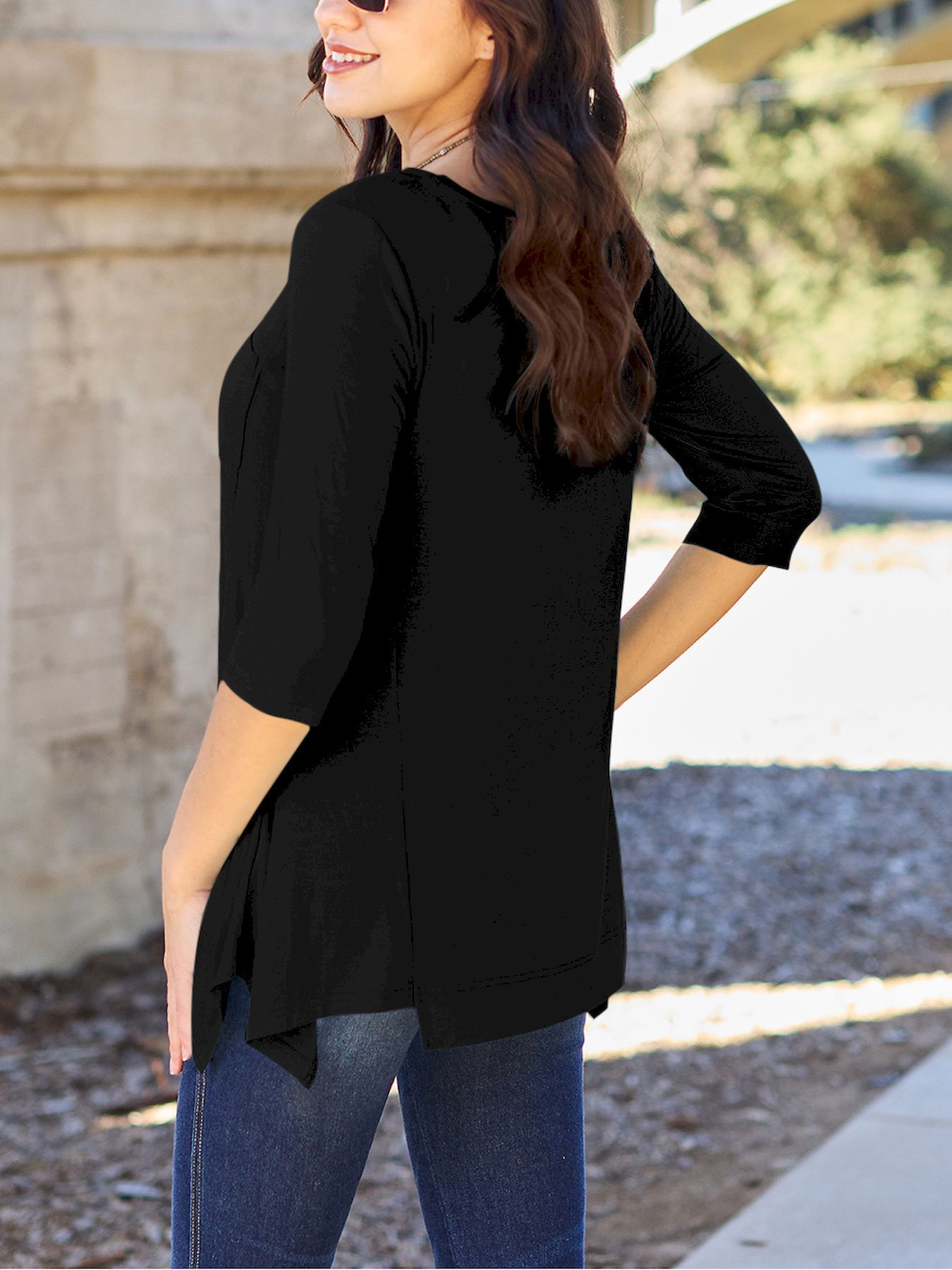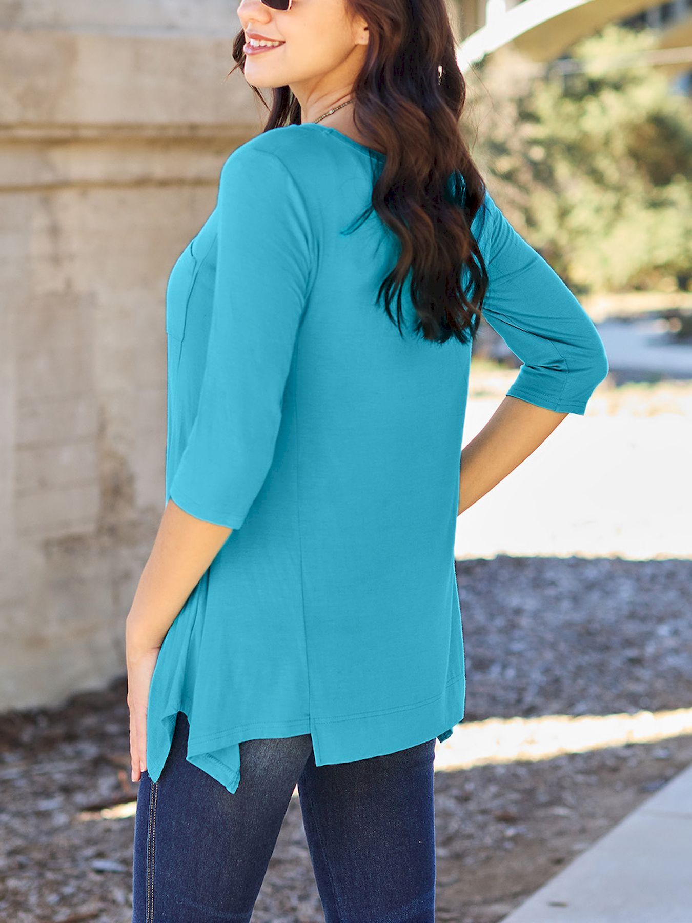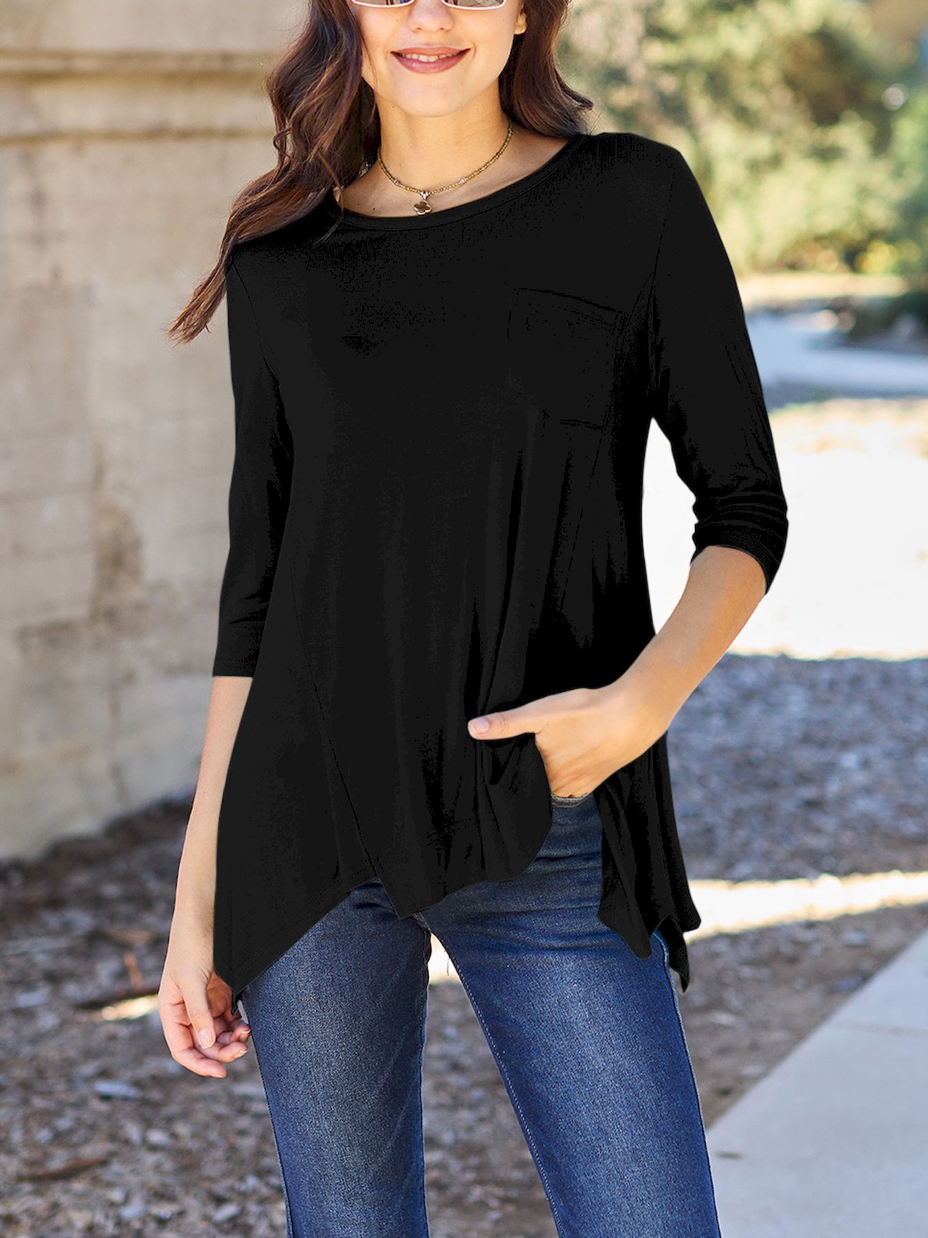 Chic Pink Asymmetrical Hem Tunic - Soft Rayon Blend, 3/4 Sleeve Casual Top with Pockets for Women - Perfect for Spring & Summer