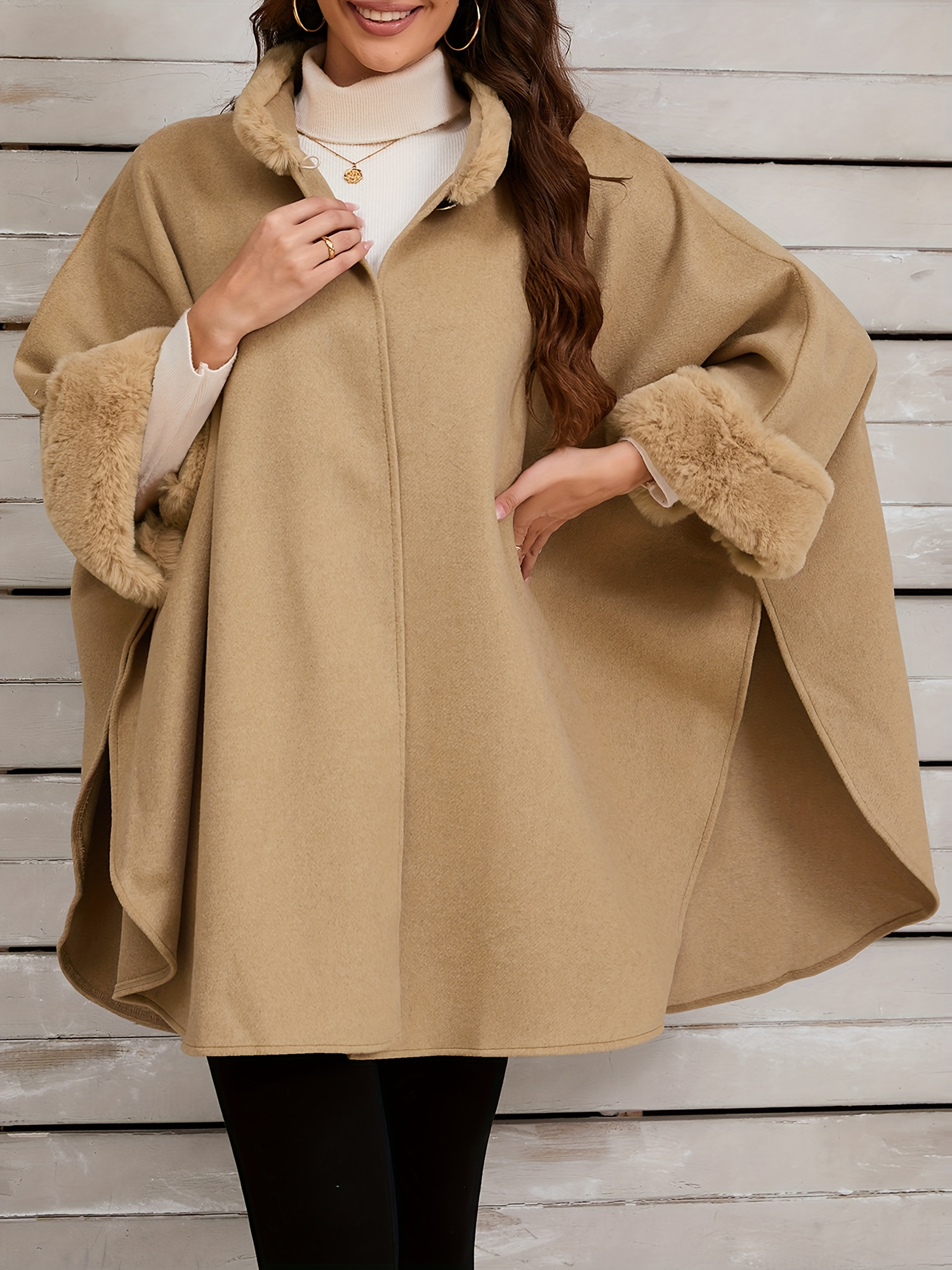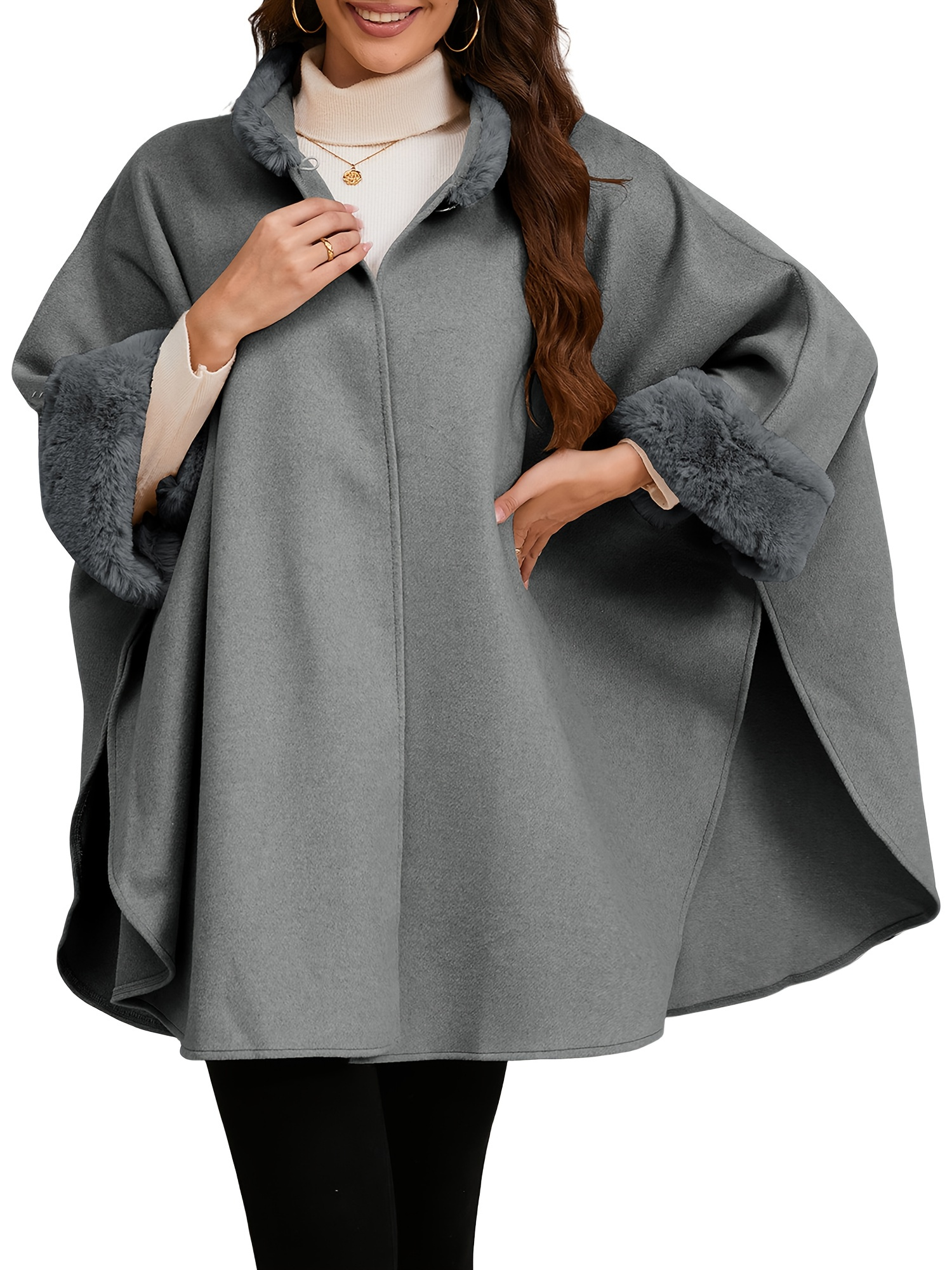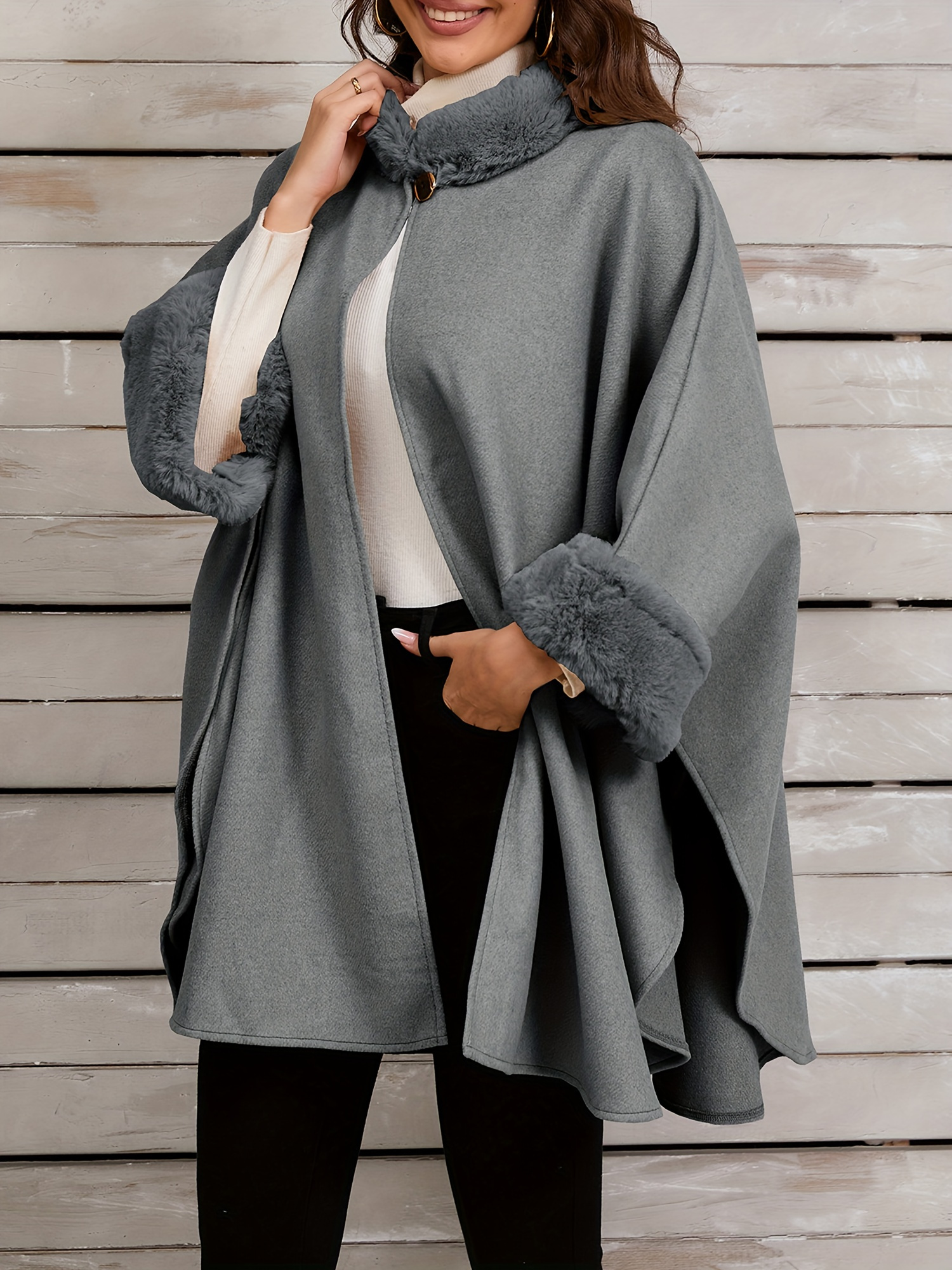 Chic Women's Cloak with Faux Fur Trim - 3/4 Sleeve, Button Closure, V-Neck Outerwear for Casual Wear