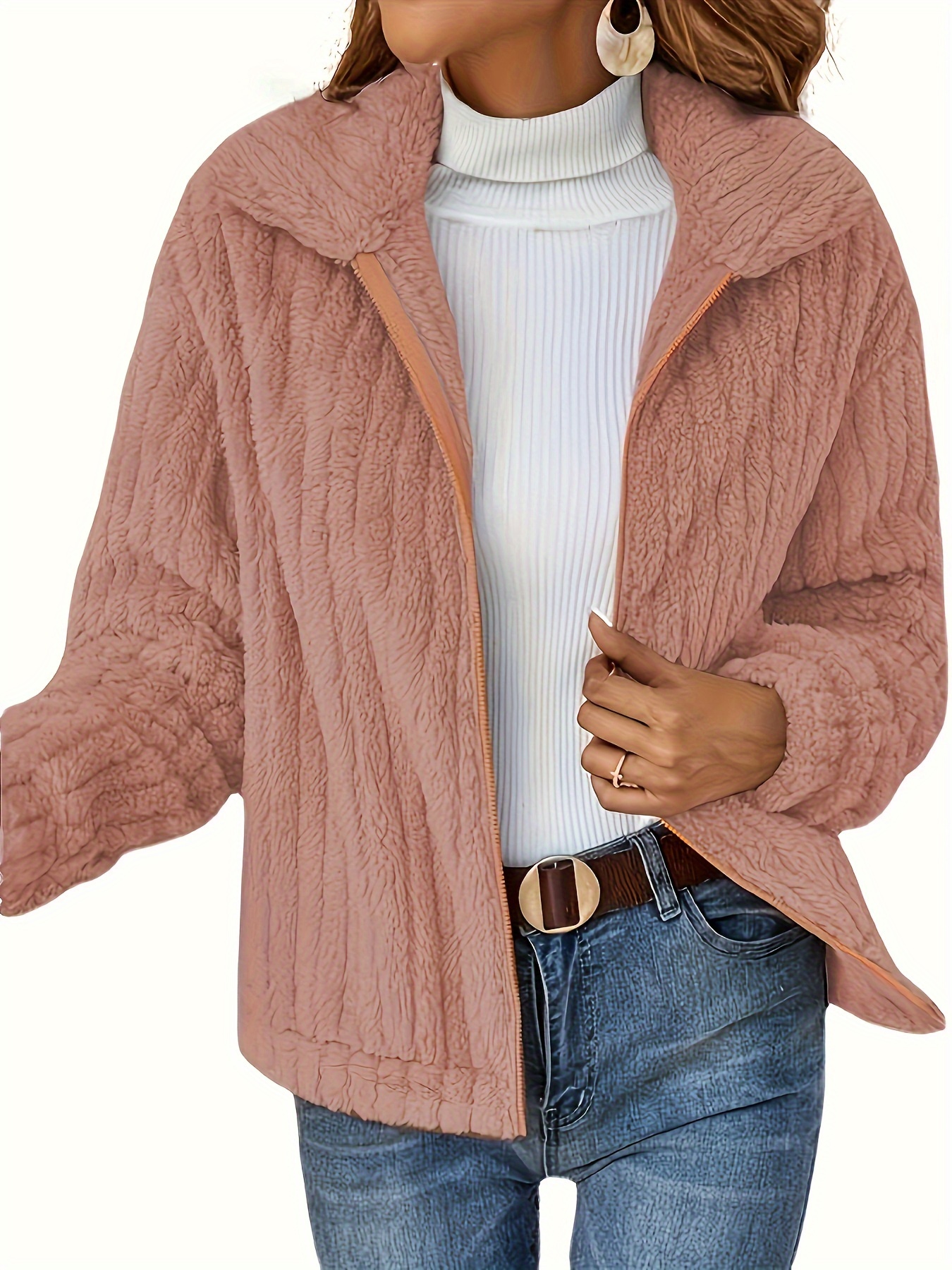 Women's Plus Size Teddy Fleece Coat - Warm And Cozy Long Sleeve Jacket With Ribbed Detail And Lapel Collar