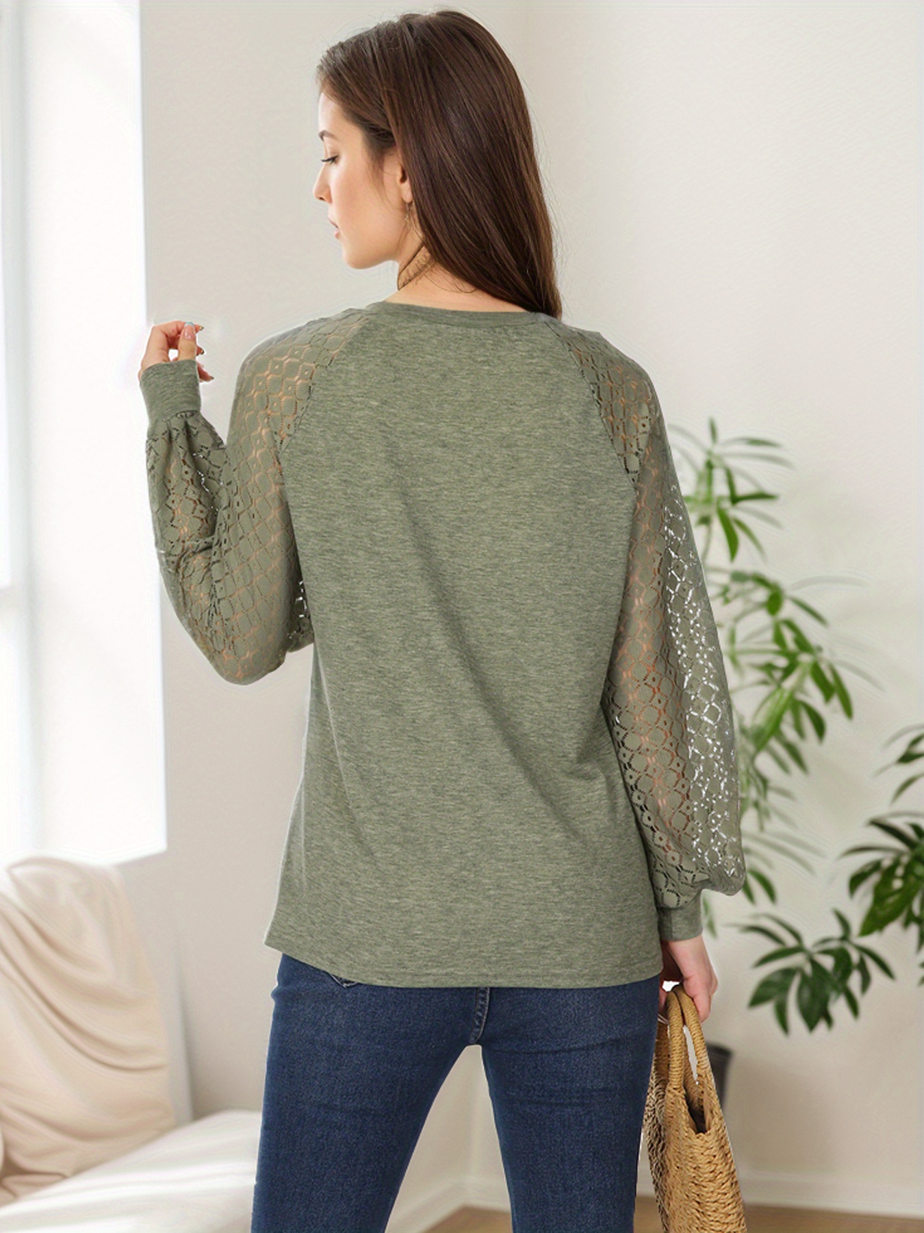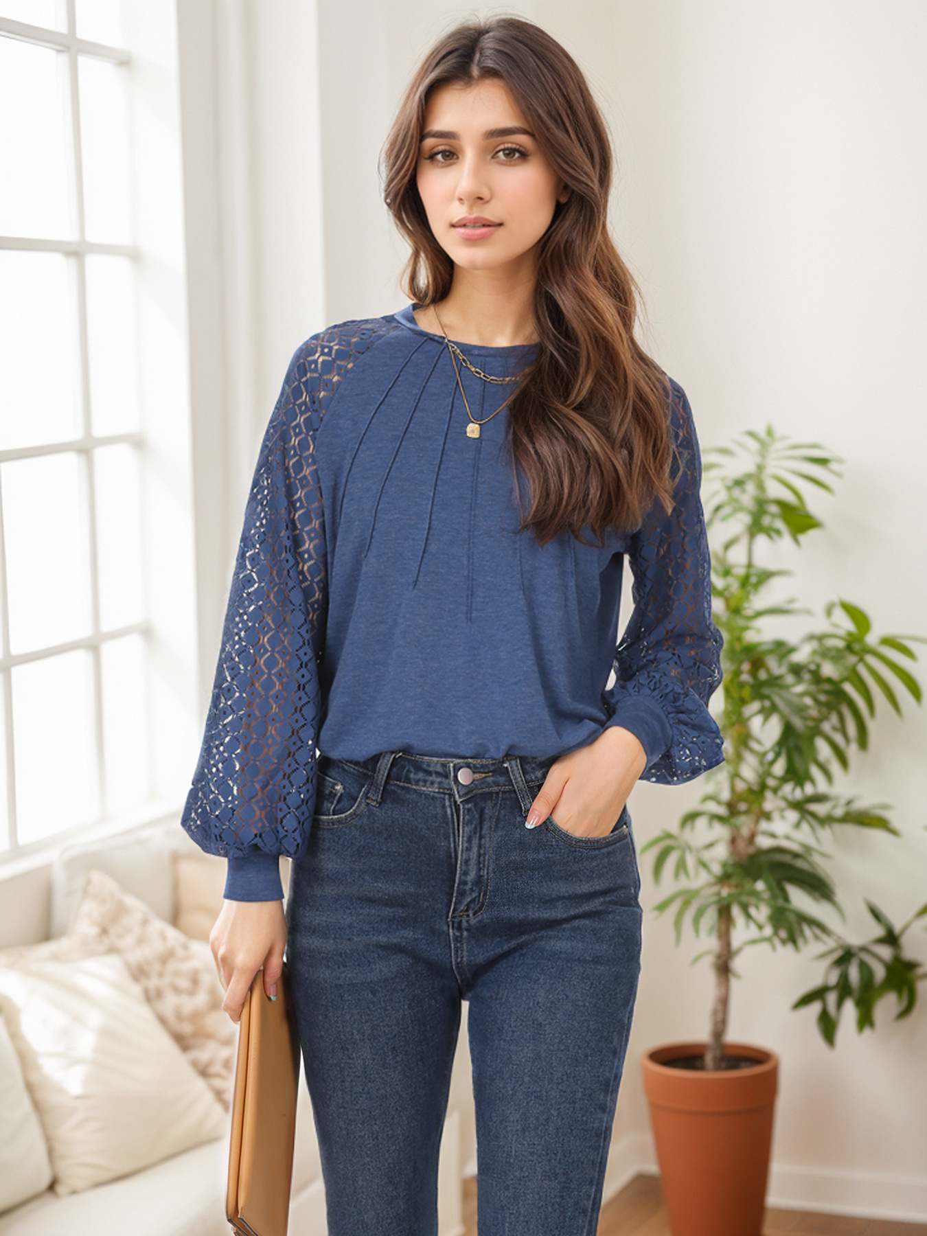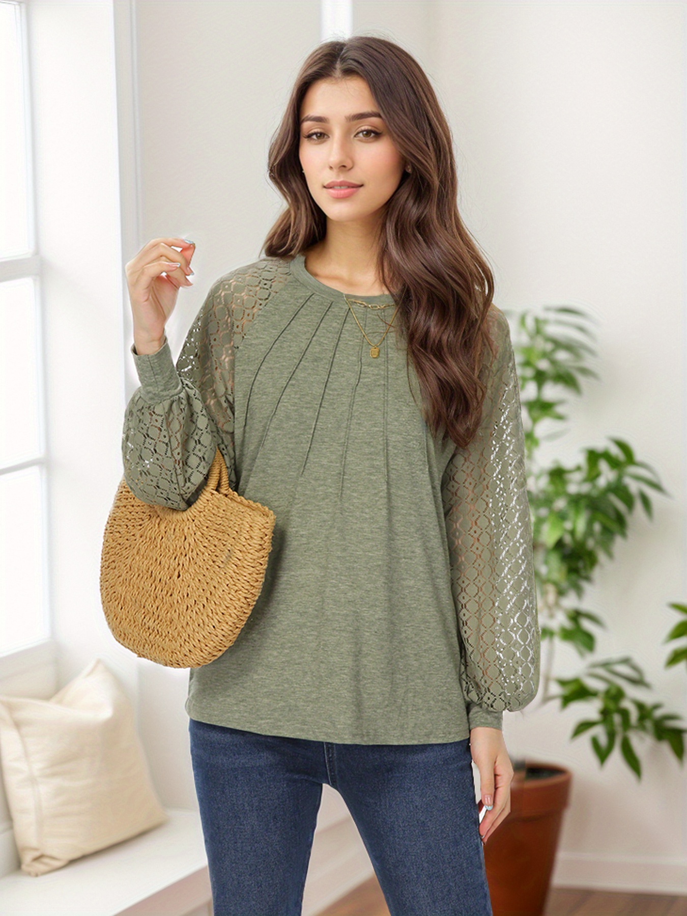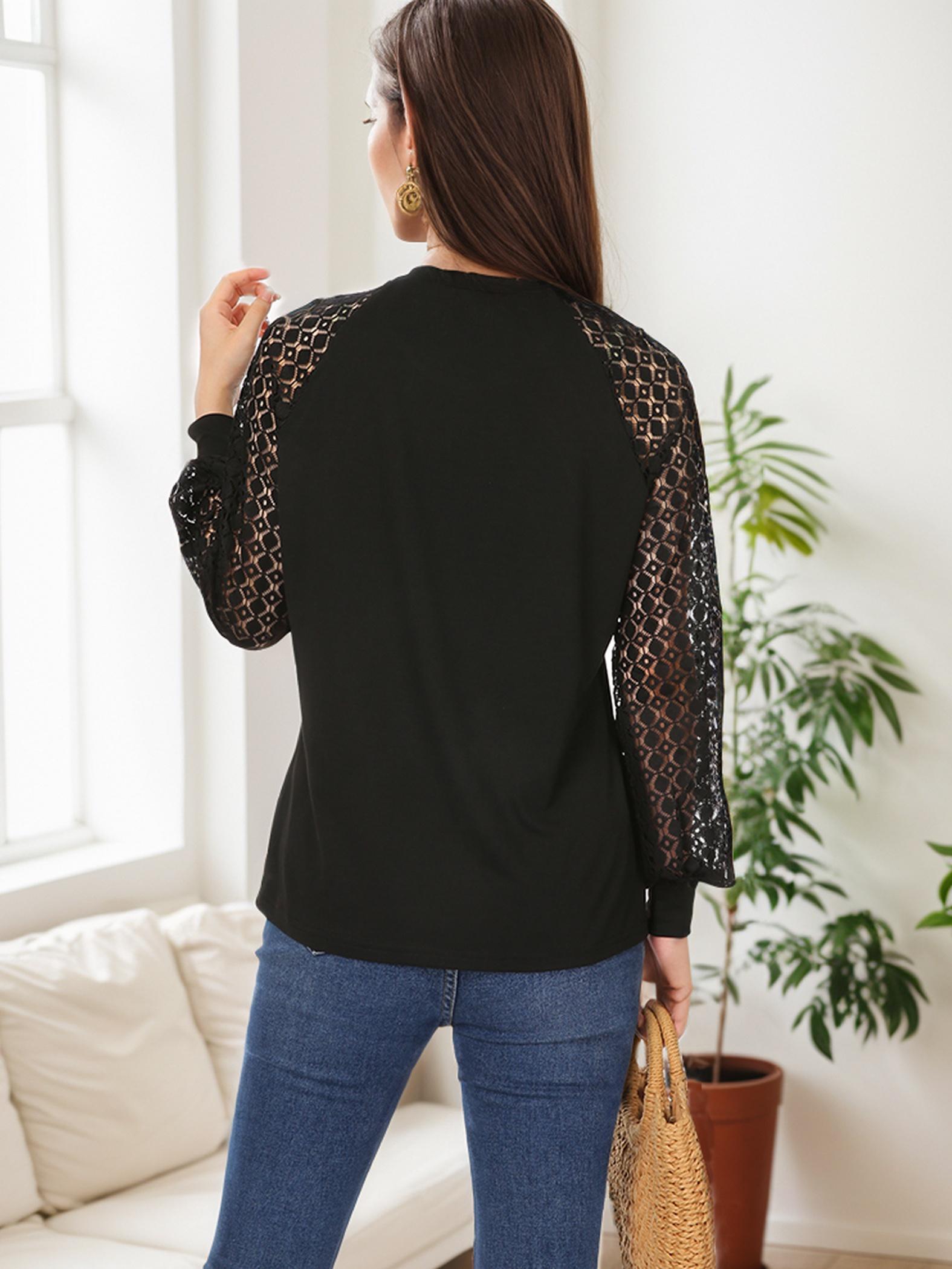 Tooluck Plus Size Women's Round Neck Pleated Lace Panel Long Sleeve Top
