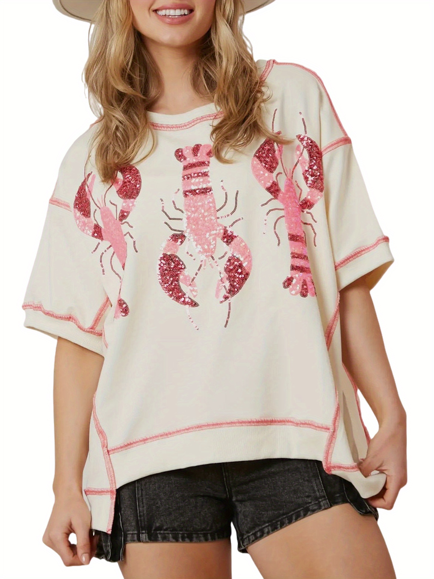 Women's Glitter Sequin Lobster & Crawfish Print T-Shirt - Casual Short Sleeve, Round Neck Top for Summer