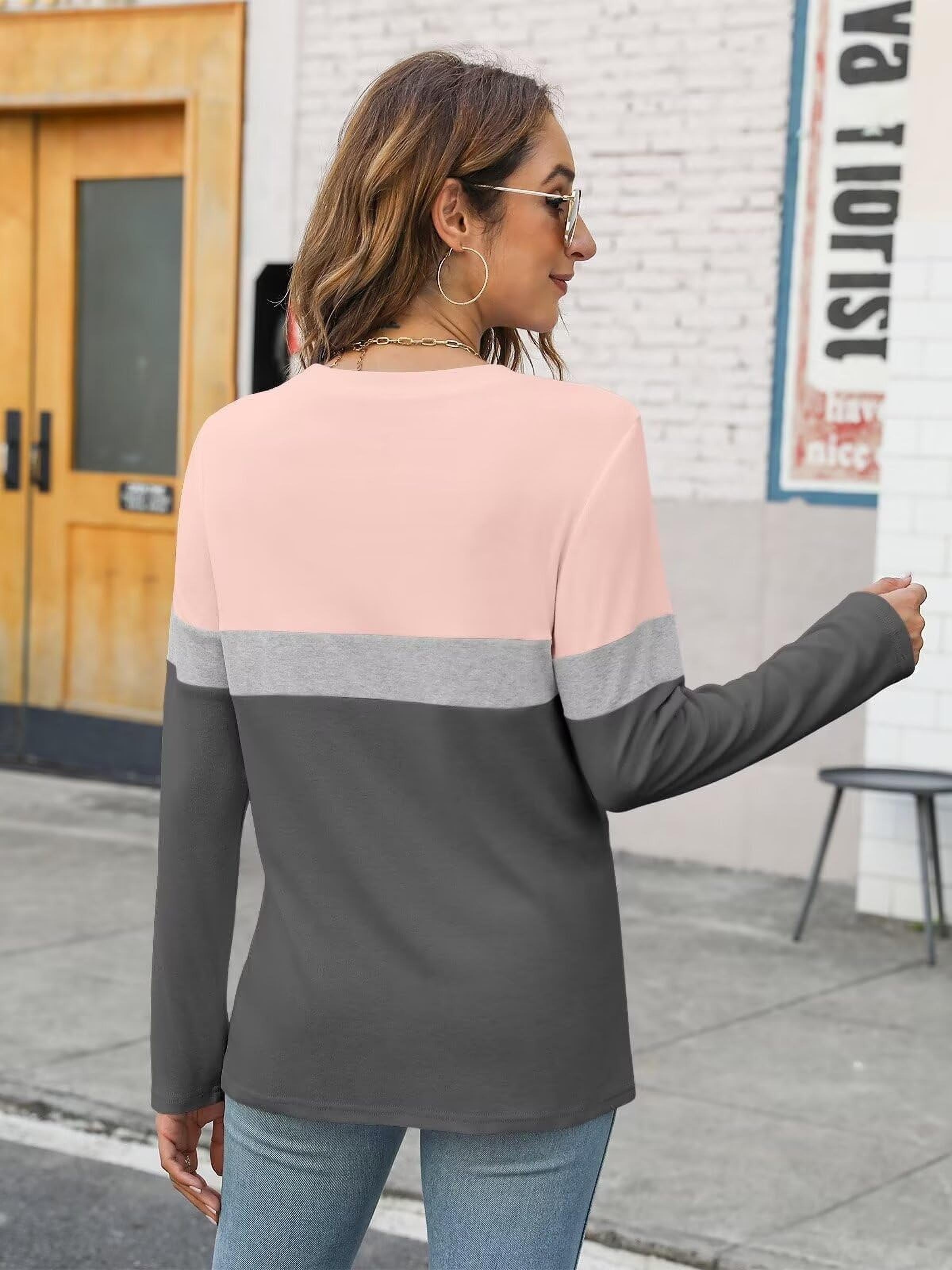 Tooluck Plus Size Women's Casual Color Block Long Sleeve Tops Crew Neck Loose Fit Blouses