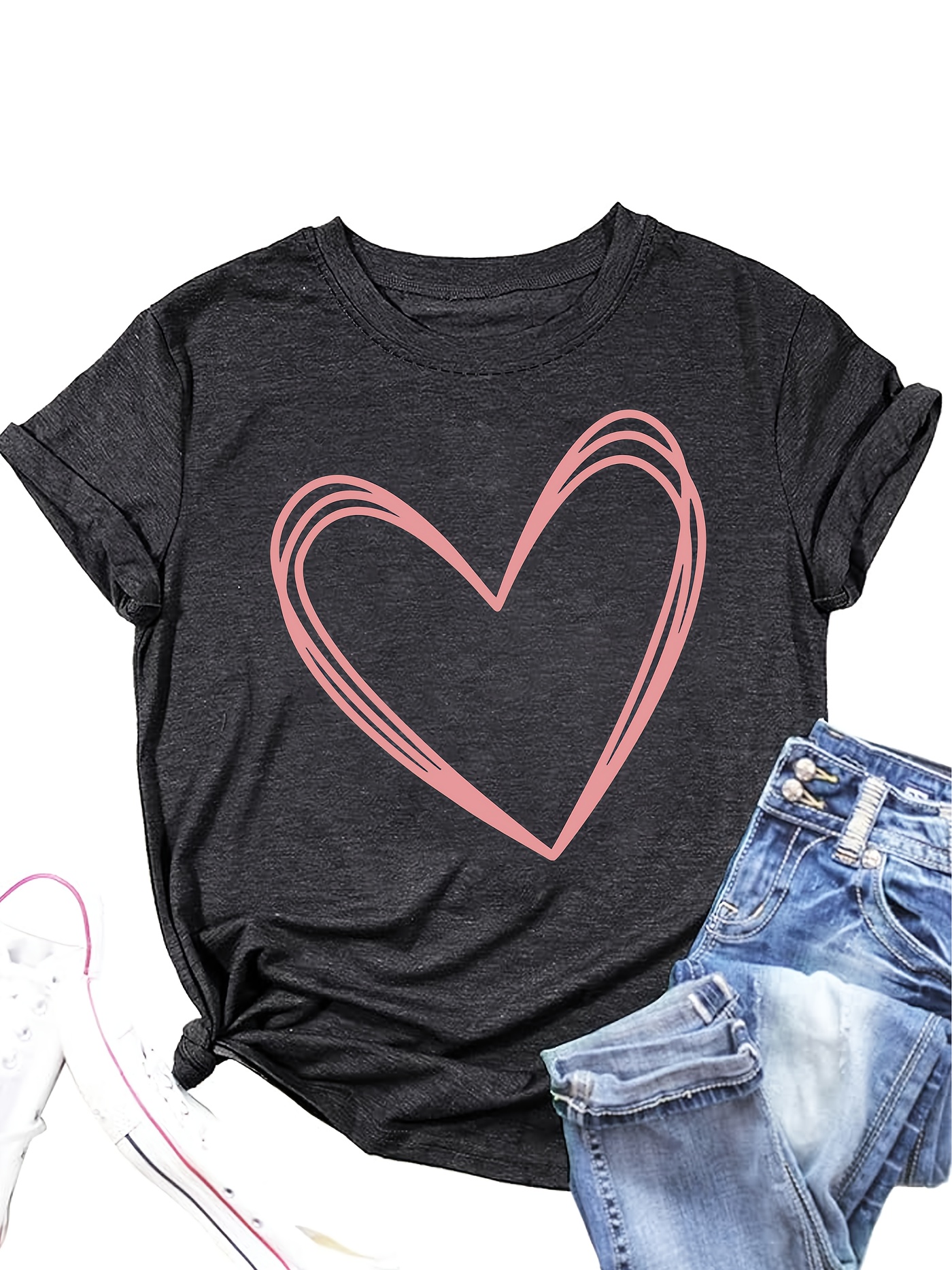 Valentine's Day Special: Casual Short-Sleeve T-Shirt for Couples - Breathable Rayon Blend, Machine Washable, Crew Neck with Geometric Heart Design