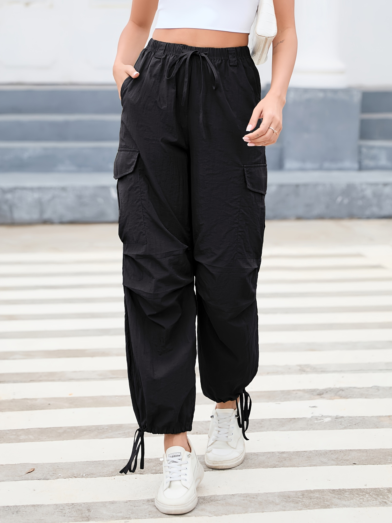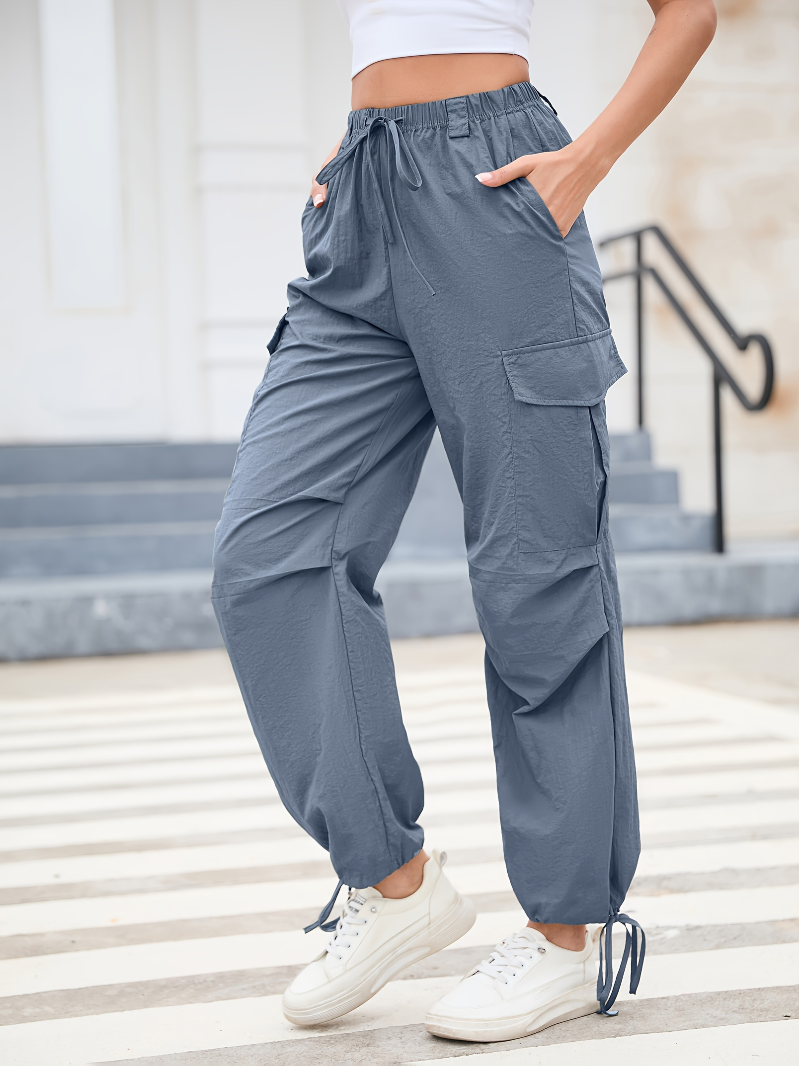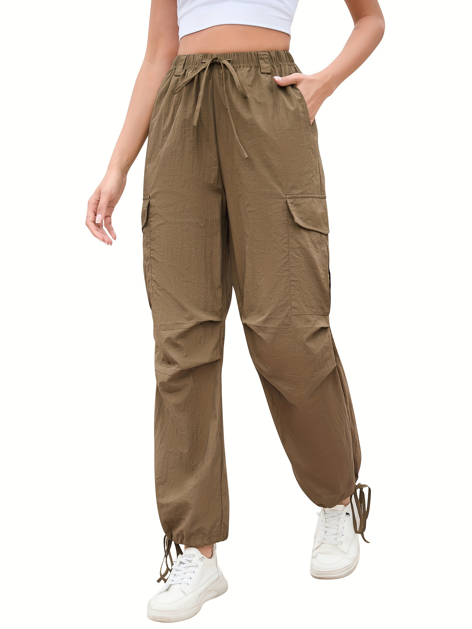 1pc GoyRrbay Women'S Casual Nylon Cargo Jogger Pants - Solid Color Drawstring Low Waist Baggy Trousers, All-Season Loose Fit Long Pants for Going Out, Woven Sports Pants for Adults