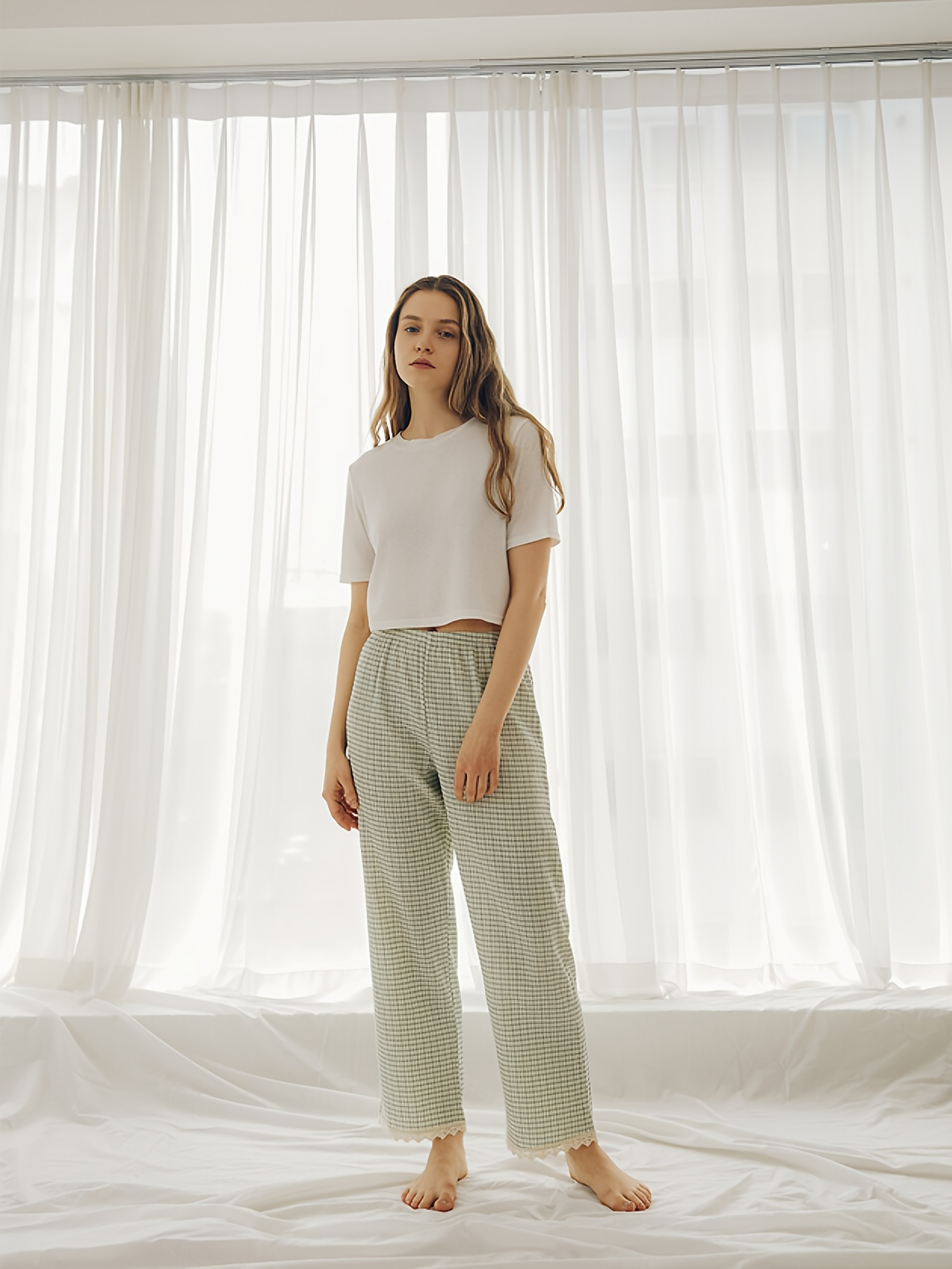 1pc Women'S All-Season Casual Polyester Lounge Pants with Lace Detail - Solid Color Woven Sports Pants for Home Comfort