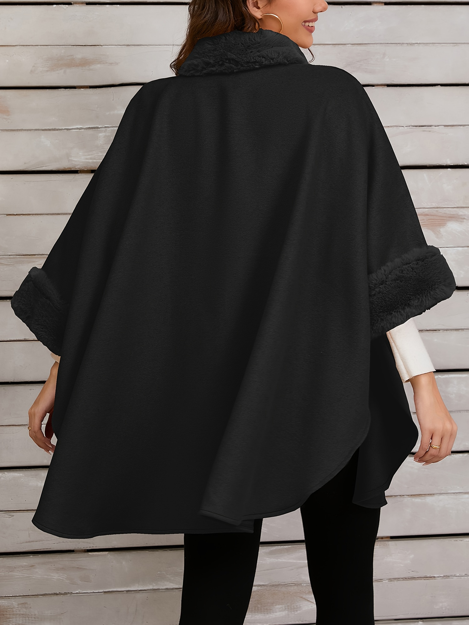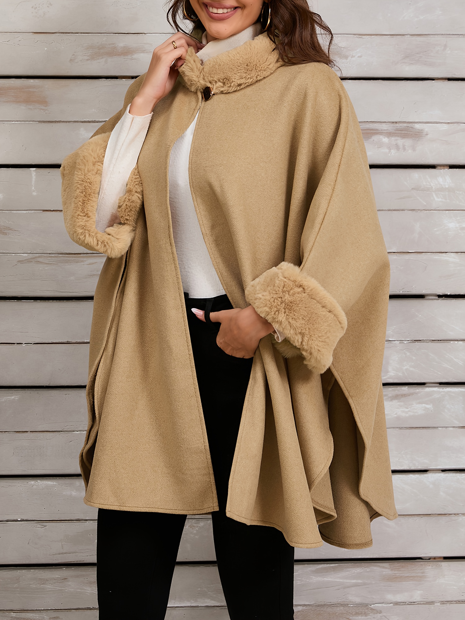 Chic Women's Cloak with Faux Fur Trim - 3/4 Sleeve, Button Closure, V-Neck Outerwear for Casual Wear