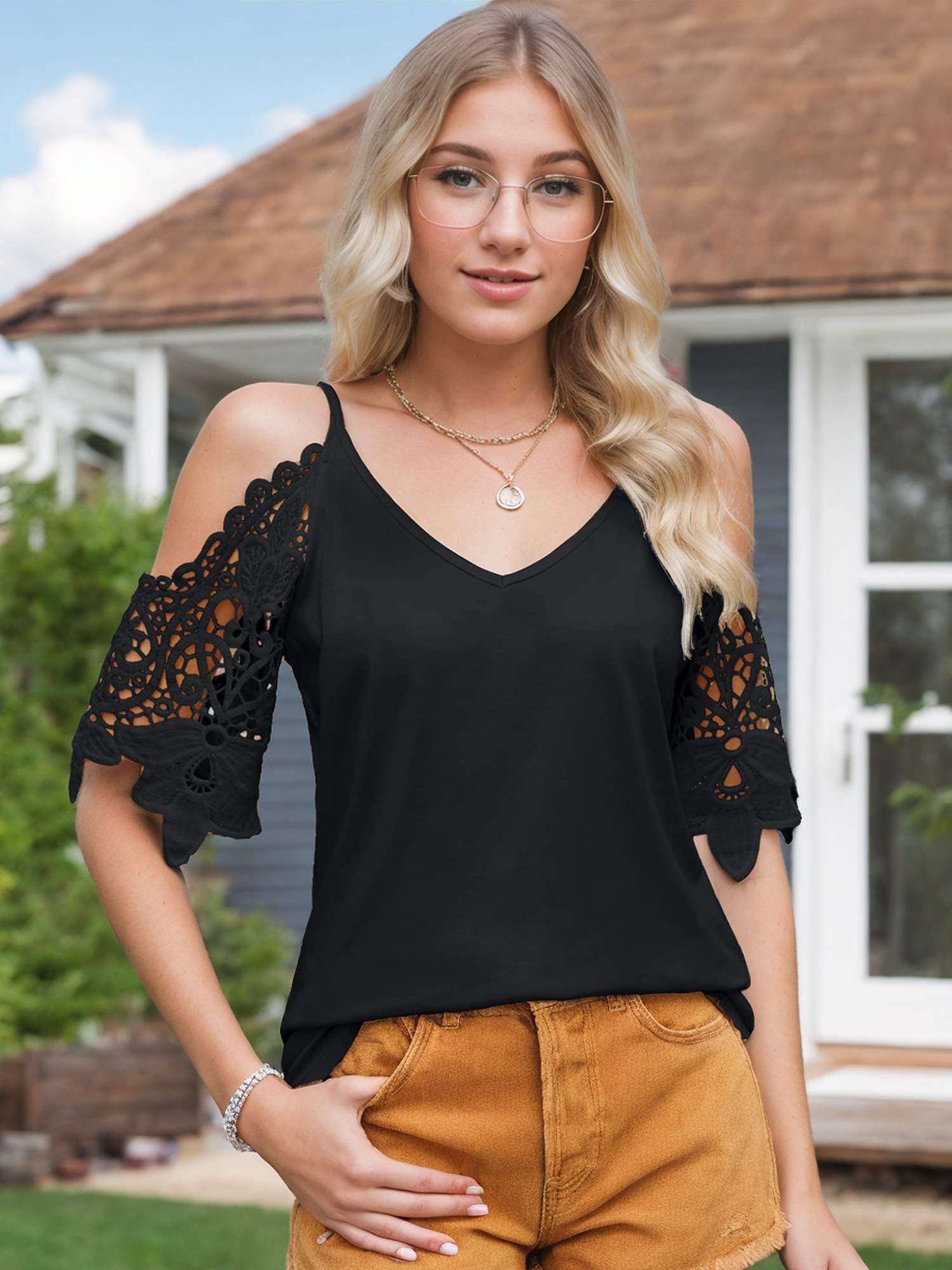 Plus Size Women'S V-Neck Lace Off-Shoulder Short-Sleeved T-Shirt