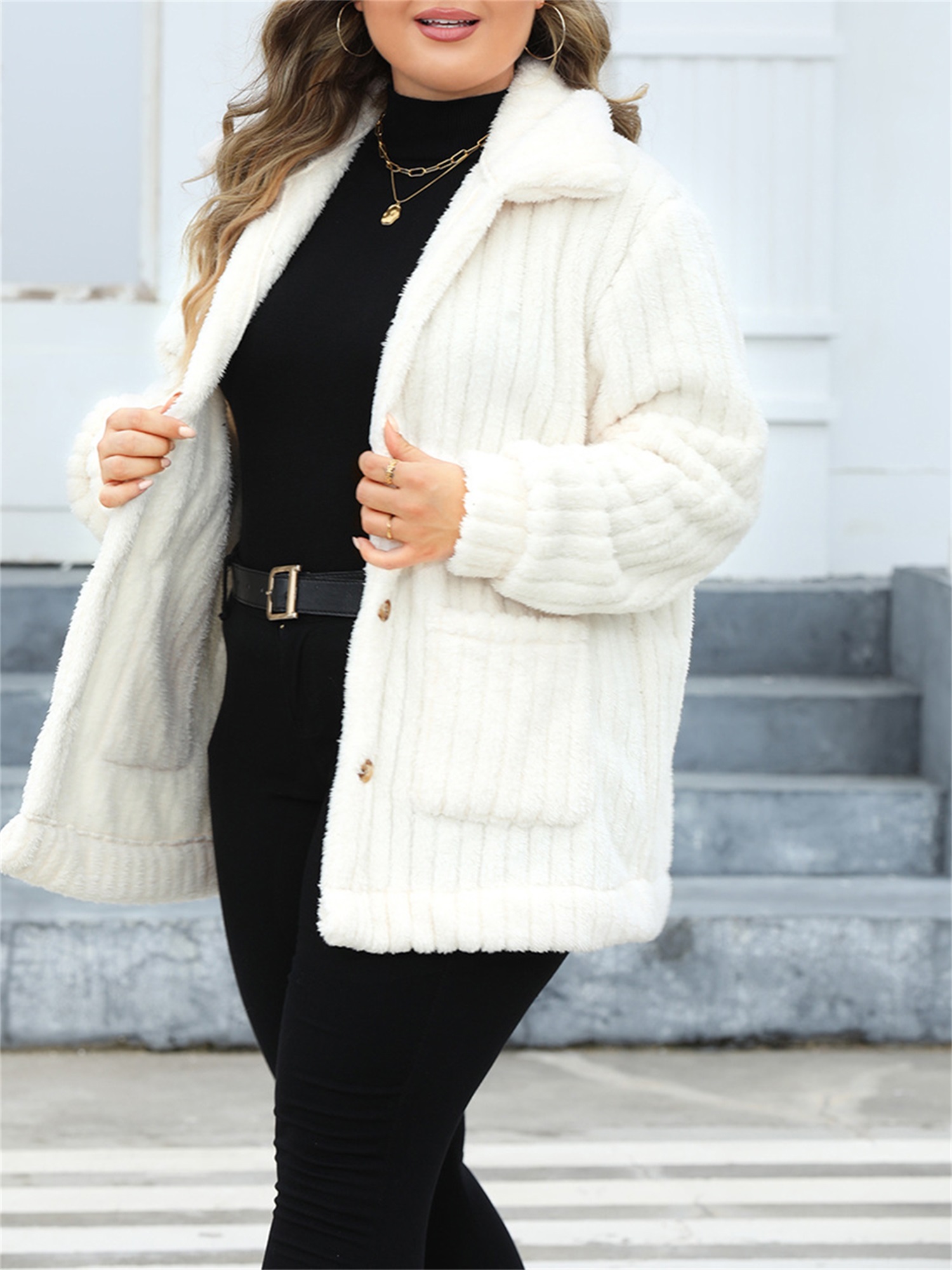 Plus Size Women'S Winter Jacket, Casual Lapel Collar, Cotton Blend, Slight Stretch, Solid Color, Reversible Plush Long Sleeve Cardigan Coat for Outwear Streetwear