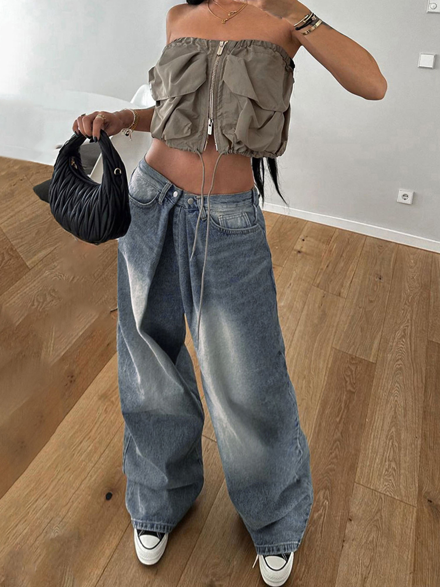1pc Women'S High Waist Wide-Leg Faux Denim, Casual Style Solid Color Long Pants, Polyester Knit Fabric with Button Detail, All-Season Loose Fit Faux Denim Trousers